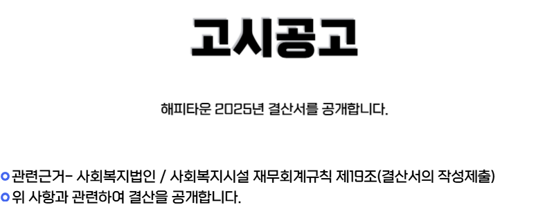 | [고시공고] 해피타운 2025년도 후원금(금전/물품)수입 및 사용내역 공개 (0) | 2026.03.04 |