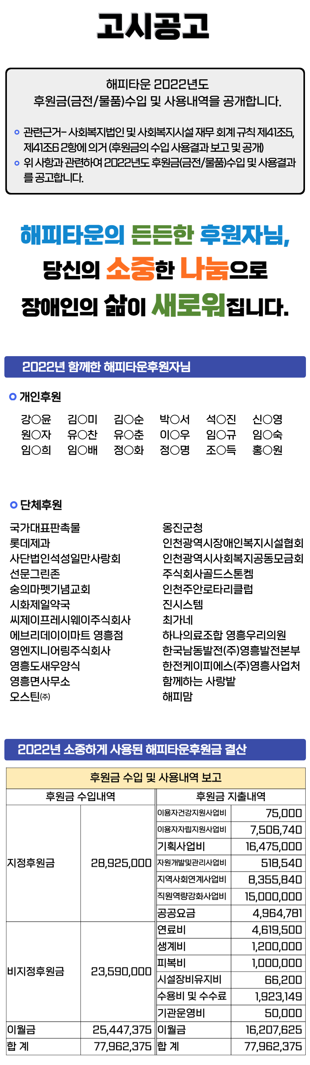 [고시공고] 해피타운 2022년도 해피타운 후원금(금전/물품)수입 및 사용내역 공개