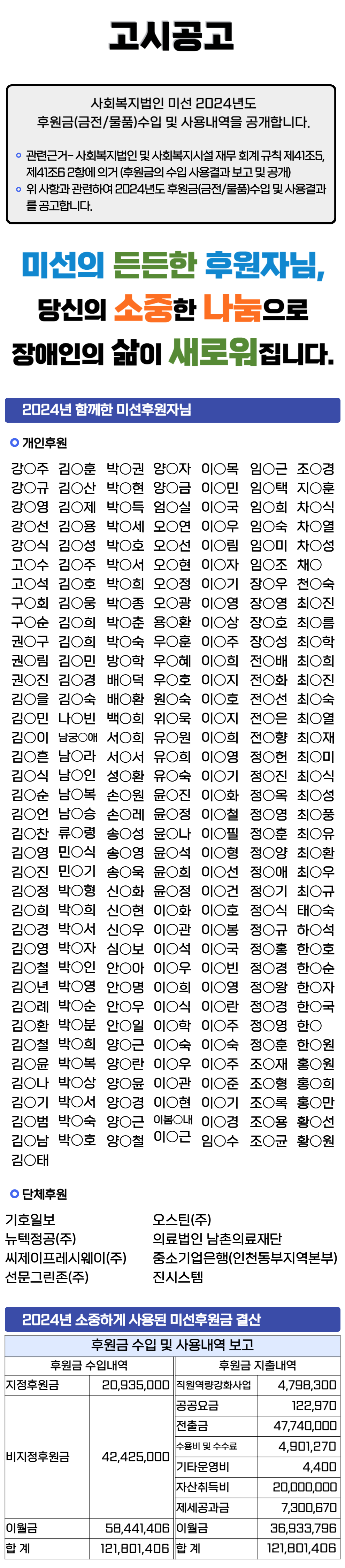 [고시공고] 사회복지법인 미선 2024년도 후원금(금전/물품)수입 및 사용내역 공개